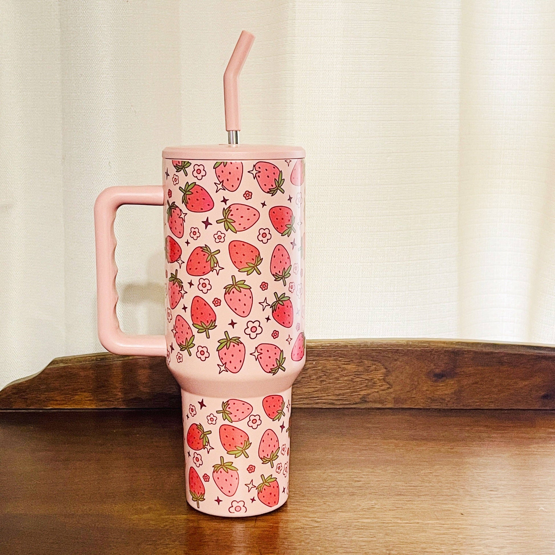 This 40oz tumbler is perfect for keeping your drinks cold or hot! The tumbler features a strawberry pattern on a pink background. It comes with a lid and straw for easy sipping. Dishwasher safe, but hand washing is recommended for preserving the tumbler's design.