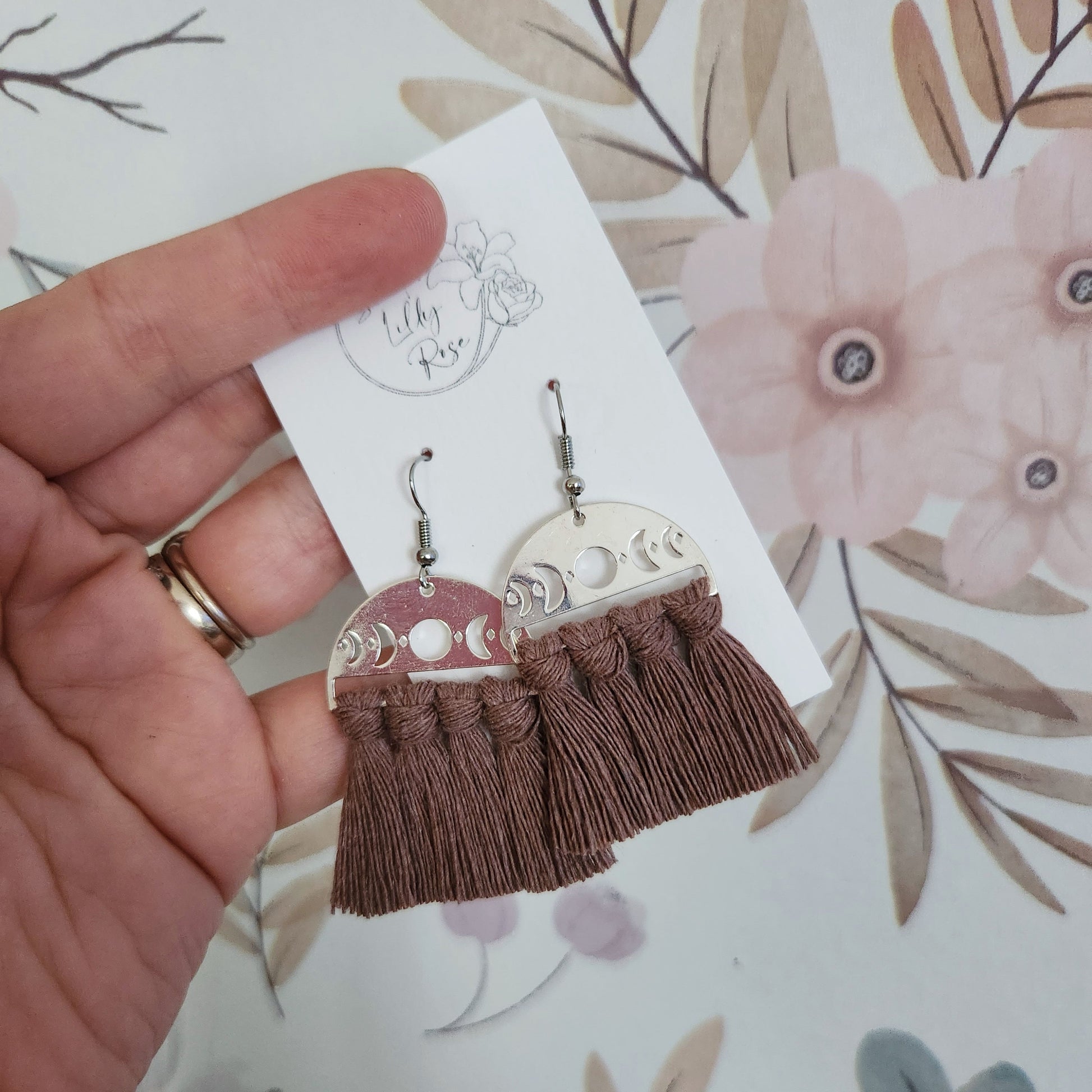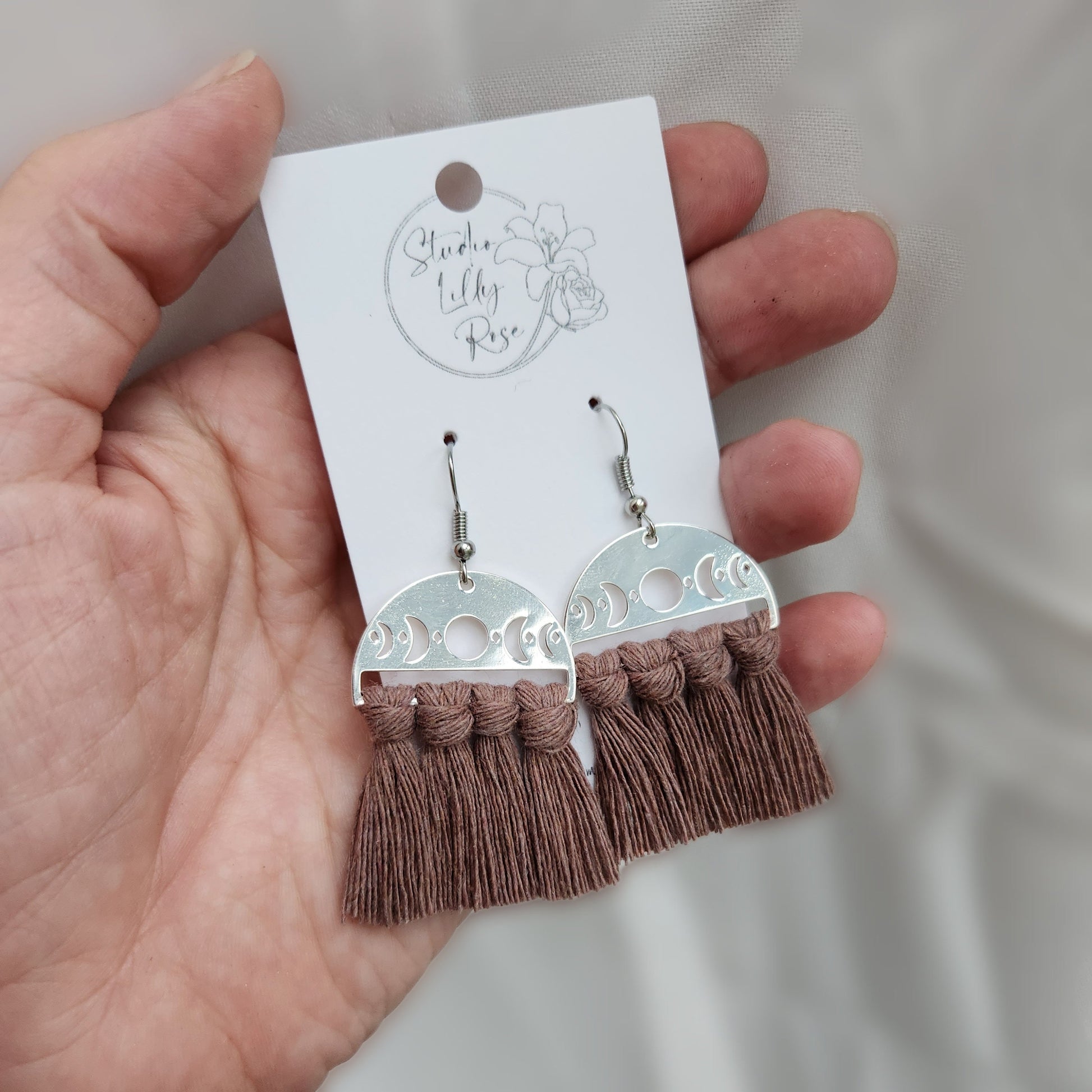 Moon Phase dangle earrings with mauve/mink colored cotton macrame